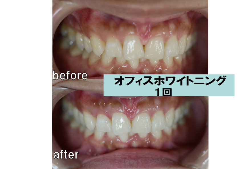 もともと白い歯(A1)でしたが、患者様のもう少し白くしたいという主訴をもとに自然にみえるよう患者様と相談の上、オフィスホワイトを選択。